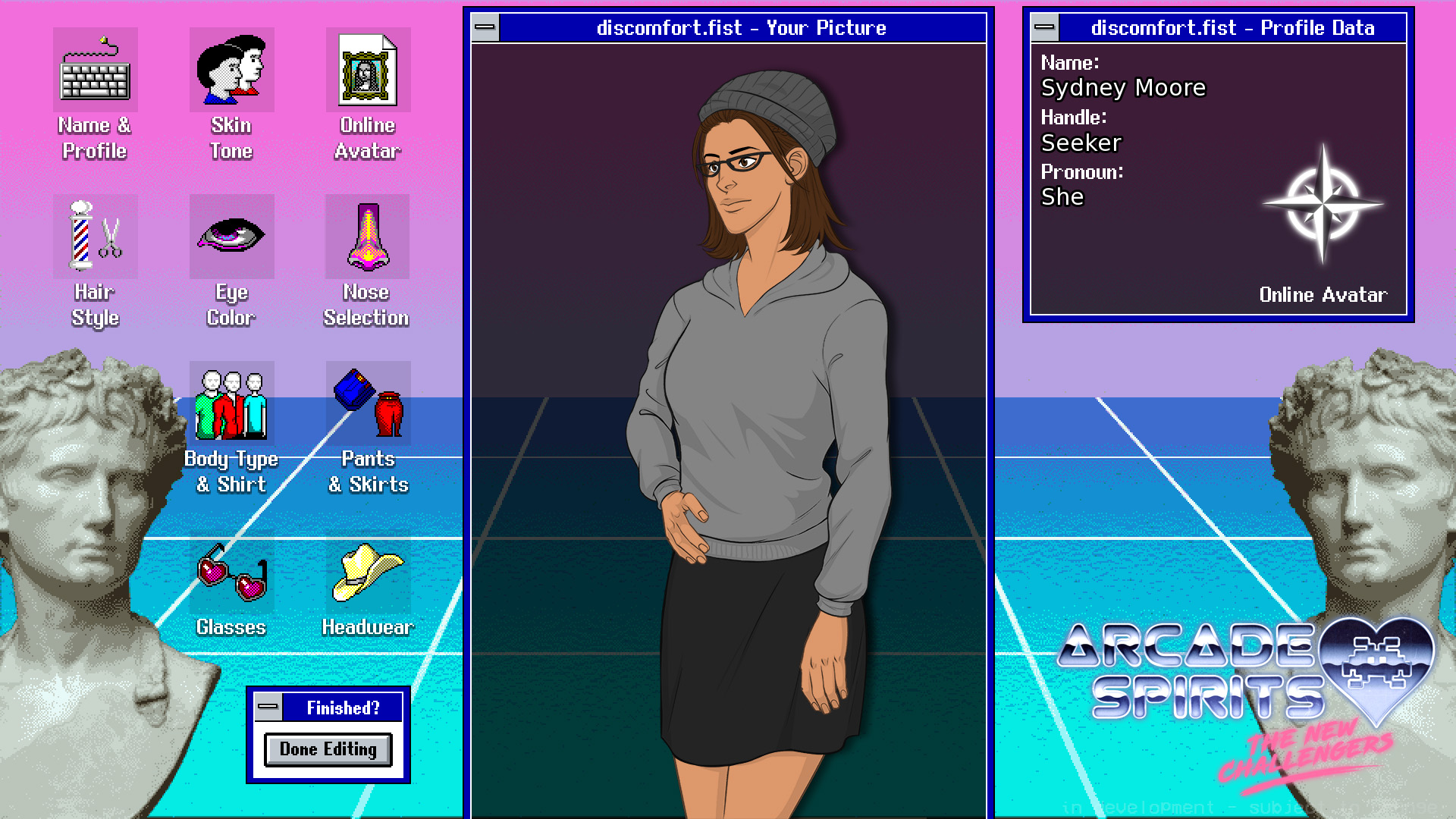 With the power of VaporWare for Workgroups 3.11 and the discomfort.fist profile editor, you can re-design the player as you like! We've expanded the customization options tenfold from the original Arcade Spirits, bringing over all the options you know and love from before, while adding new ones!