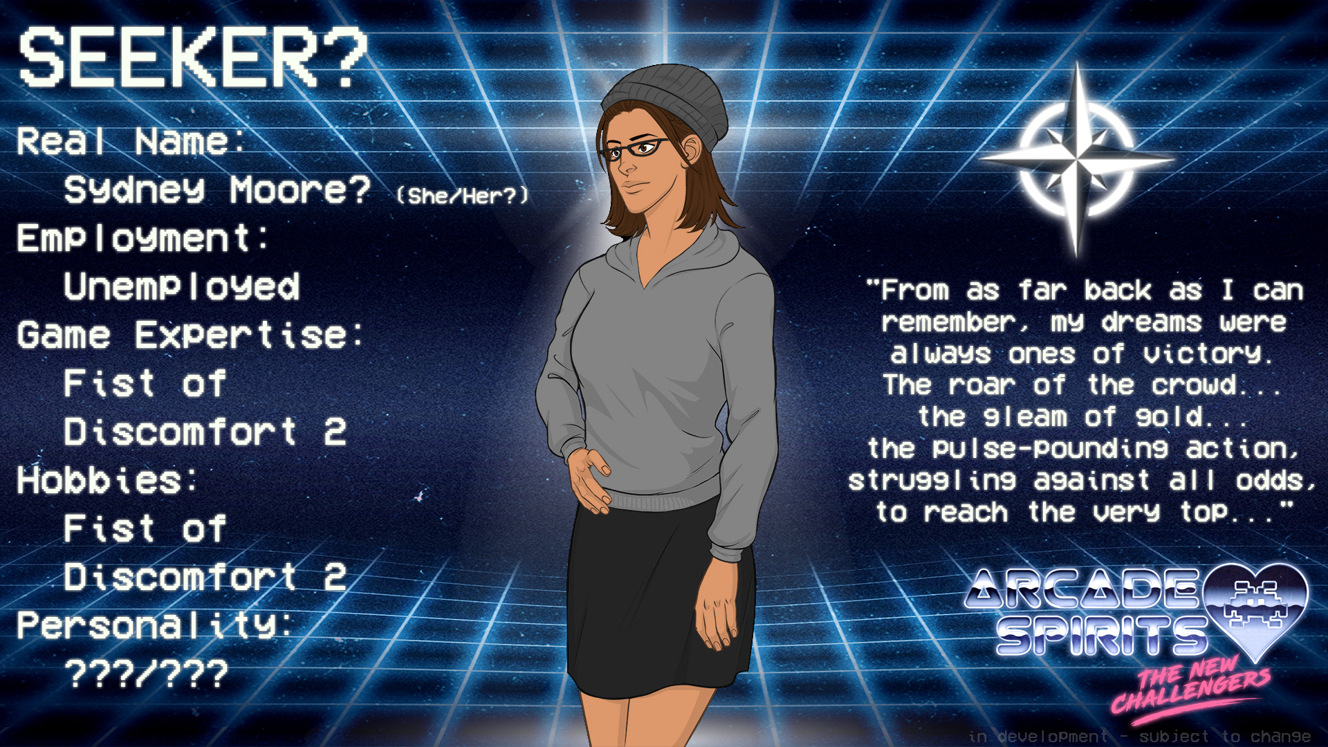 The thrill of victory, and the agony of defeat... you've known both. All your life you've used your natural aptitude to dominate at competitive video games to fill your hours with conquest after conquest. Working from the same hand-me-down computer you had as a kid, its guts replaced again and again to the point of becoming the "PC of Theseus," your current game of focus is the worldwide phenomenon known as Fist of Discomfort 2. But playing with online randos, well... not exactly the best experience. And with an officially sanctioned Pro Tour on the horizon, maybe it's time to look into being recruited into a team that can take you all the way to the top...