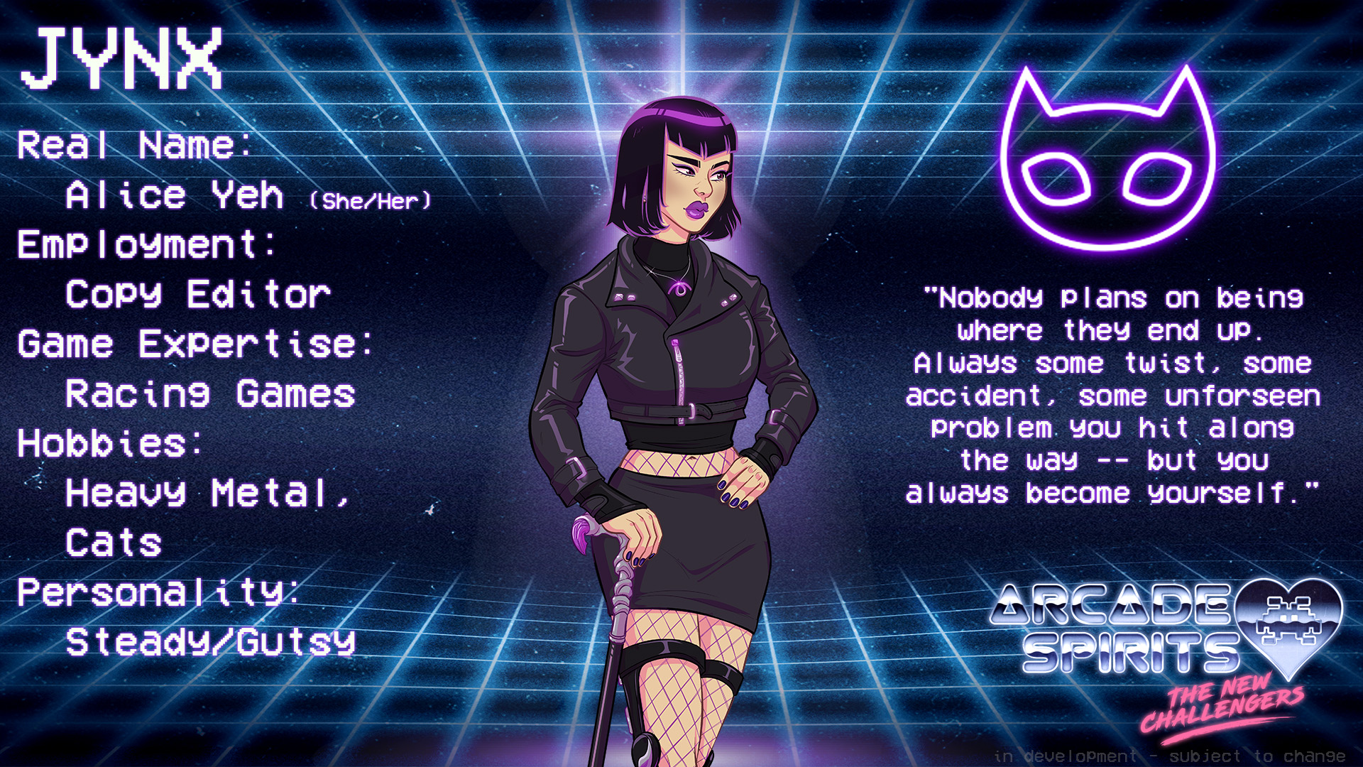 Jynx. Jynx is a Chinese-American wman in her mid twenties, with a short bob of black-and-purple hair, with matching purple lipstick. She wears a black leather jacket, zipped up, and a matching miniskirt. She has wrist and knee braces and a walking cane. Real name: Alice Yeh (she / her). Employment: Copy editor. Game expertise: racing games. Hobbies: Heavy metal, cats. Personality: Steady, Gutsy. Quote: Nobody plans on being where they end up. Always some twist, some accident, some unforseen problem you hit along the way -- but you always become yourself.